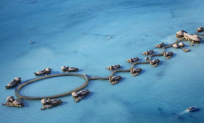 整个Soneva Jani只建有24间水上别墅,低密度布局很大决定了每间别墅的私密性。同时,连通主岛和各个别墅的水上通道被别出心裁地设计成蜿蜒的波浪状,改善了每个别墅的周围空间。任何一座别墅的露台上都可以360°欣赏印度洋风光。
