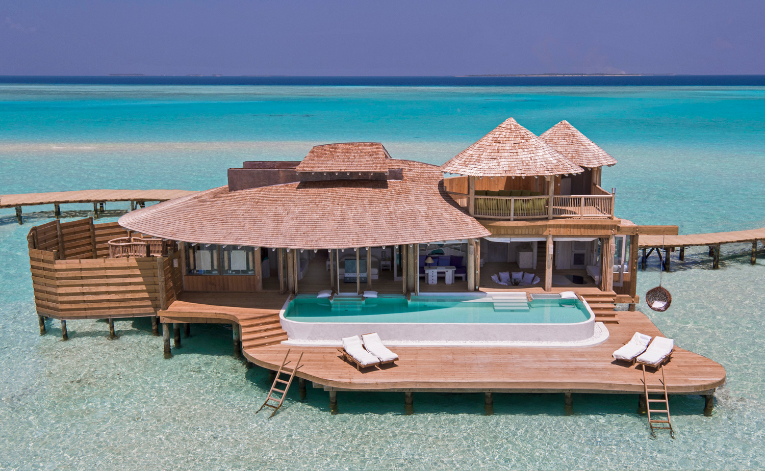 即便是Soneva Jani内最普通的单卧室水上别墅,都有着400平方米左右的超大空间,其中包括主卧、儿童专属卧室、浴室、户外淋浴池、日晒休息区、书房、私人迷你酒吧、全景凉亭、屋顶私人餐厅等完善的设施,更有面向大洋的私人海景泳池。