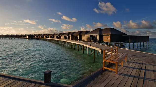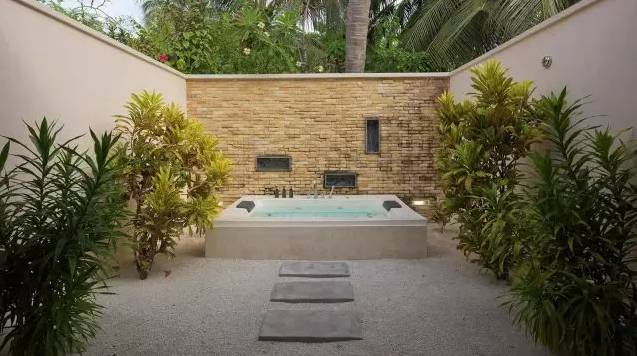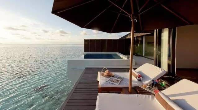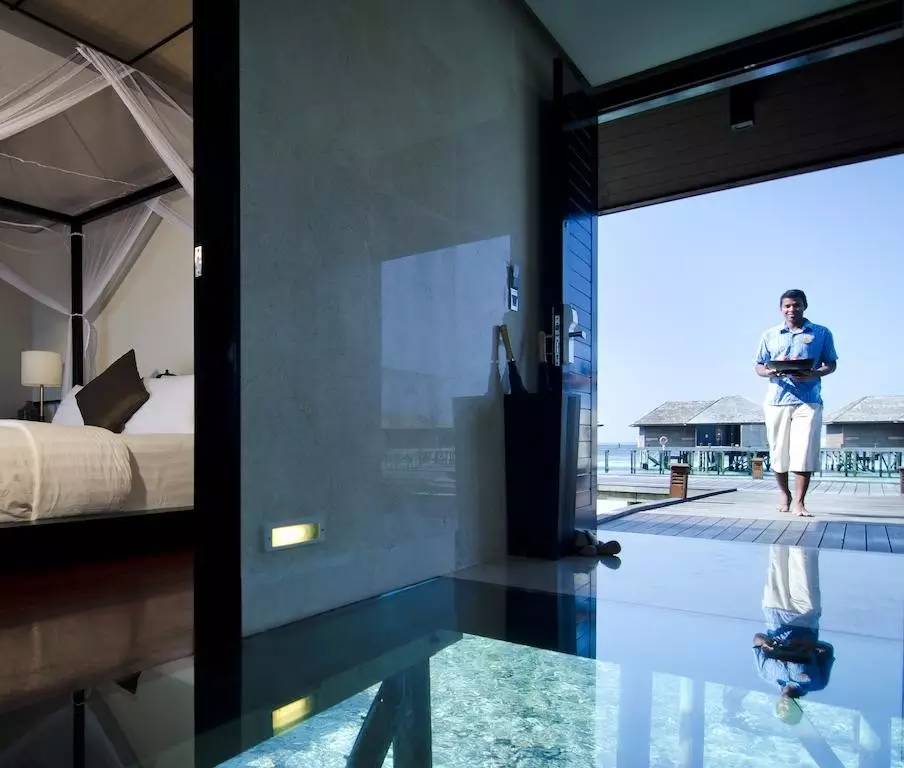 水上别墅设有透明地面玻璃,在室内就能清楚看到透明的海底。拥有7平方米的Spa池以及直通泻湖的私人平台,您可以在这里发呆,享受阳光,或畅游印度洋。