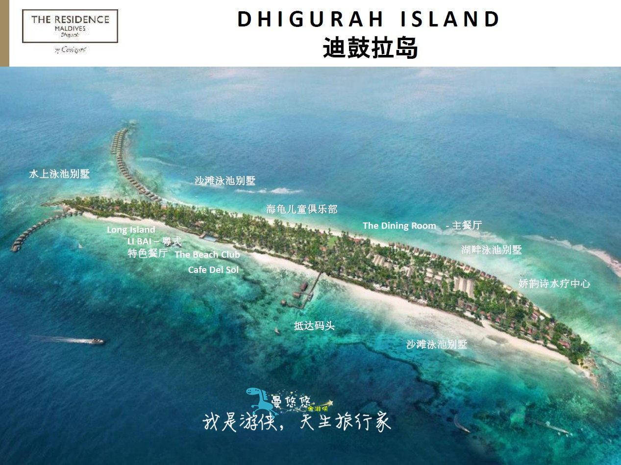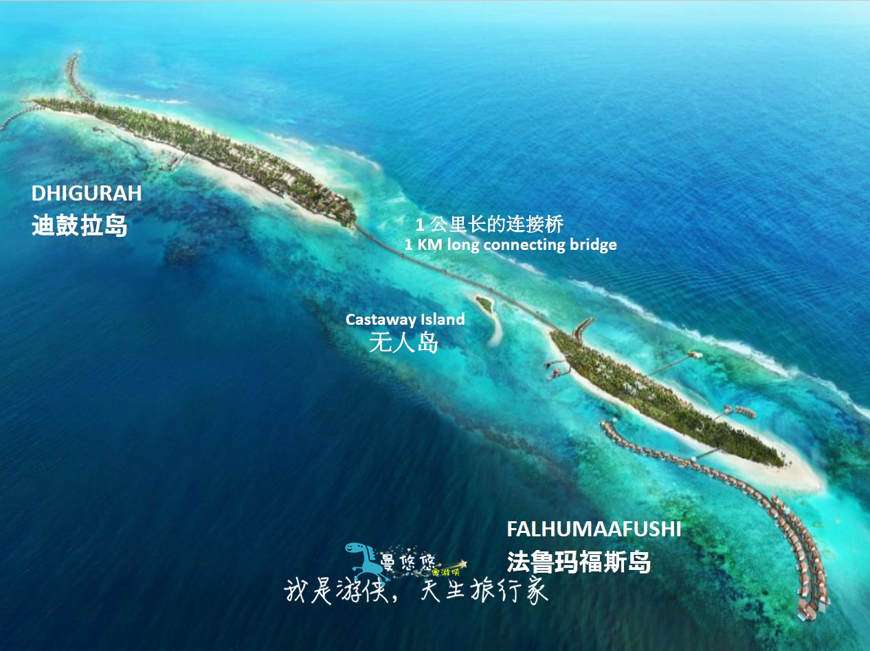 瑞喜敦迪鼓拉岛(简称瑞喜敦D岛),就建在RESIDENCE MALDIVES at FALHUMAAFUSHI(简称瑞喜敦F岛)的隔壁,中间以一条一公里的私人栈桥连接起来,俩岛之间还有一个可以免费自由上去玩耍的无人岛!