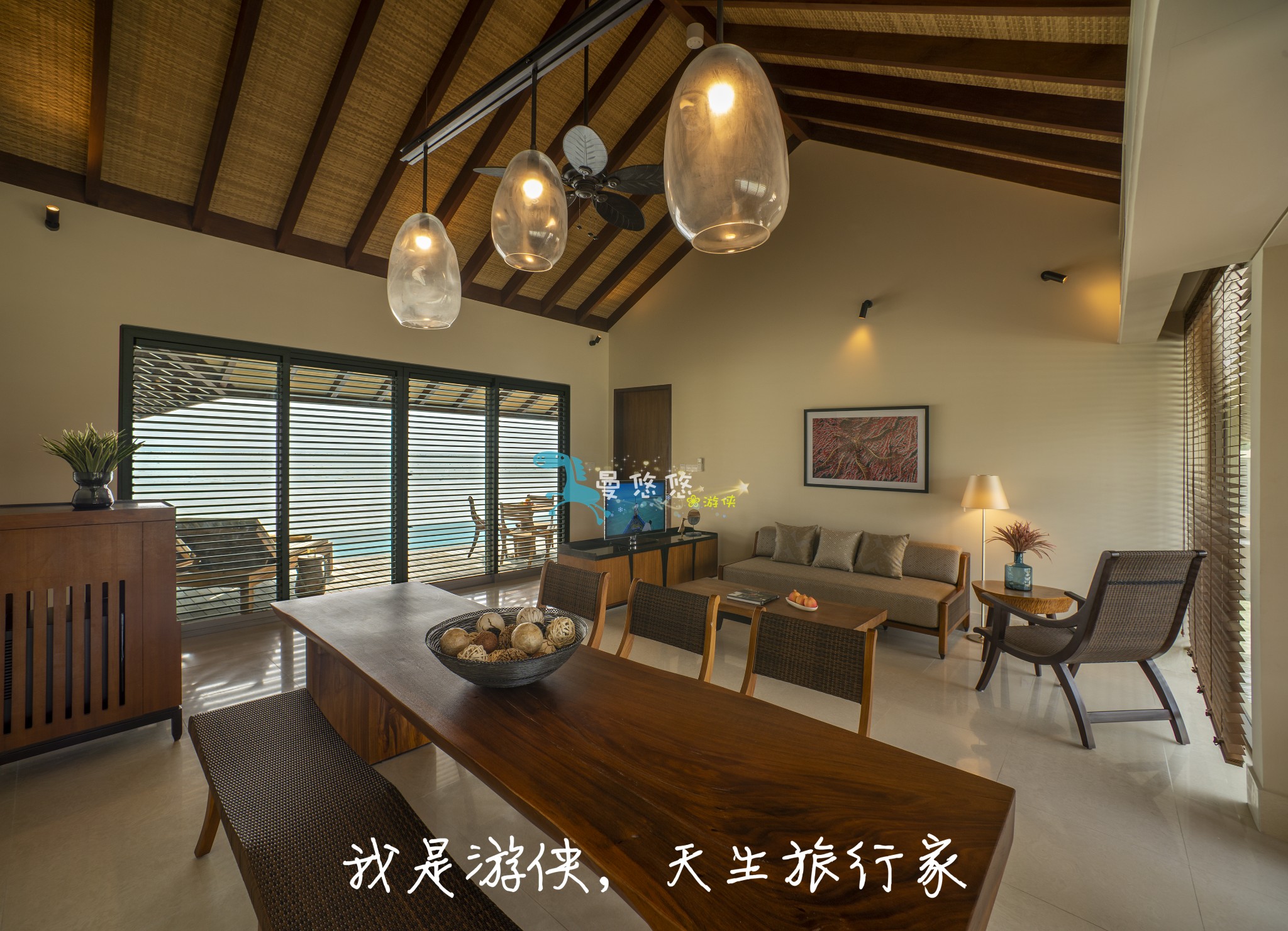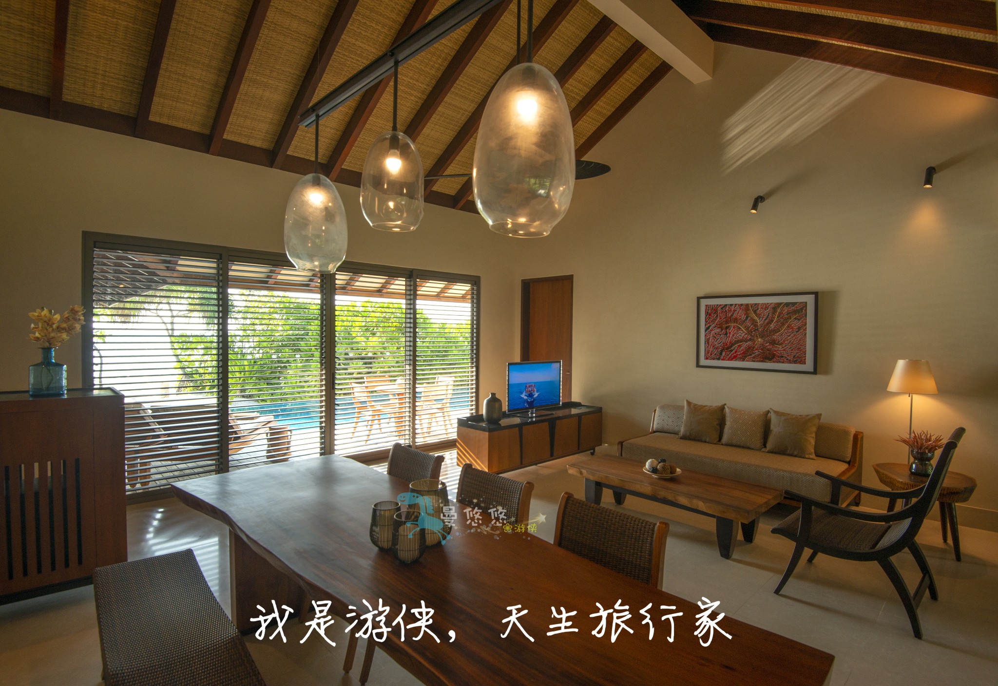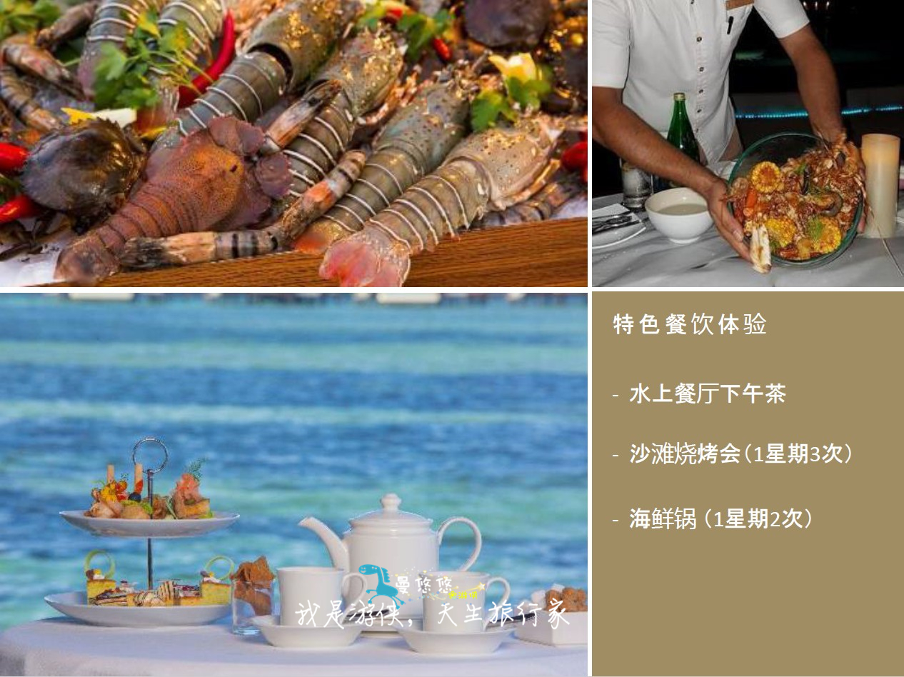 餐厅介绍:The Dining Room 餐厅的开放式理念和以海岛为灵感的设计风格,形成亲近自然的舒适用餐环境。在此享用自助早餐、午餐和晚餐时,一边欣赏泻湖景致,一边大饱口福,餐厅提供国际化美食,包括亚洲和印度洋系的特色菜肴。