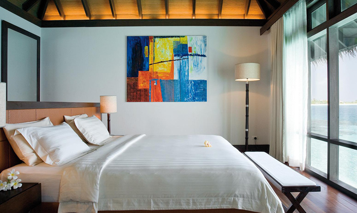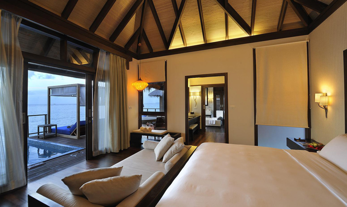 房型介绍:别墅提供24小时的管家服务,水上屋的设计非常私密,有一个带凉亭的户外阳台和一个泳池。室内设计为当代时尚风格,结合了马尔代夫的传统一用茅草加盖屋顶,让每位宾客都感到舒适与隐私。宽敞舒适的卧室加上宽广的休息室观景区,一间大浴室,室内和户外都有淋浴设备和澡盆。