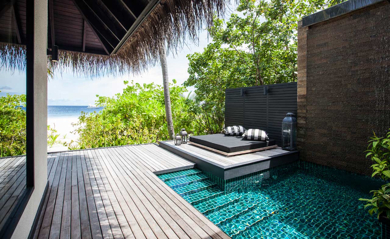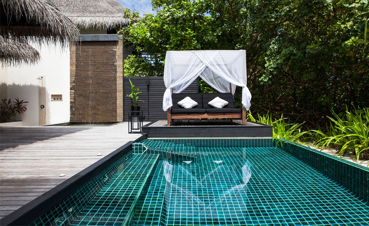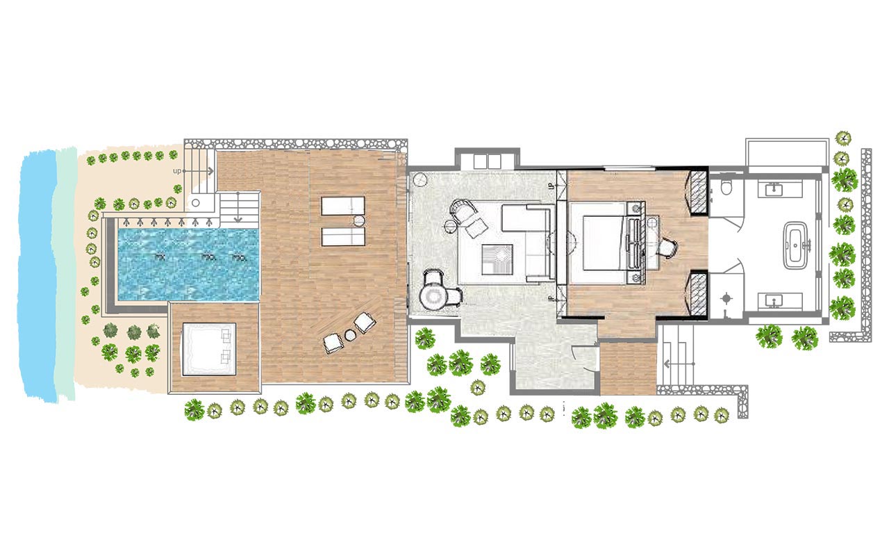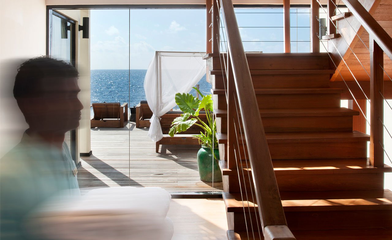 房型介绍:从海洋泳池别墅可以直接进入泻湖原始水域,在5.2米的无边泳池、户外甲板或遮阴的日光躺椅你可以欣赏到惊人的印度洋景观,落地窗休息让你不会错过阳光下的任何一刻的风景。客人可以从卧室或宽敞的躺椅休息区进入户外甲板。