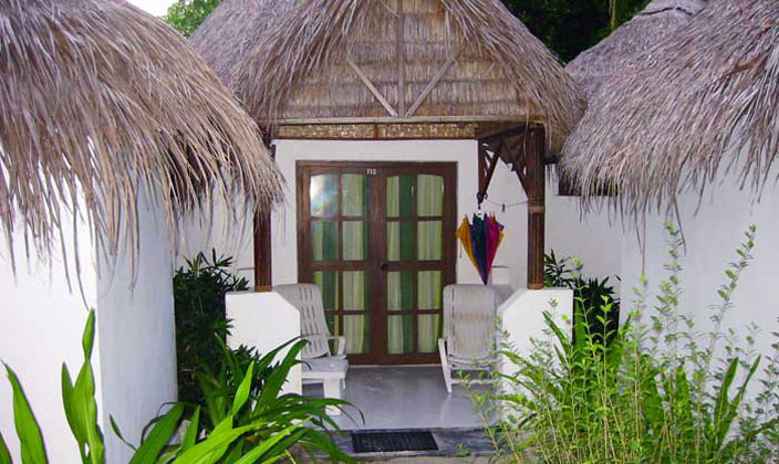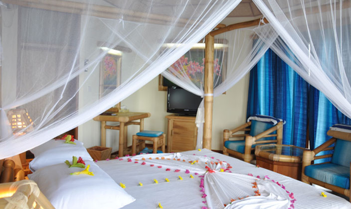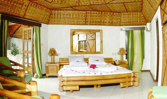 房型介绍:原始海岛风格,房子呈六边形,屋顶有厚厚的茅草,房间里的所有家具都是用竹子和藤木做的,非常自然,电器及设施比较简单。豪华房前有阳光躺椅,给忘却时间的你一个休憩的场所。